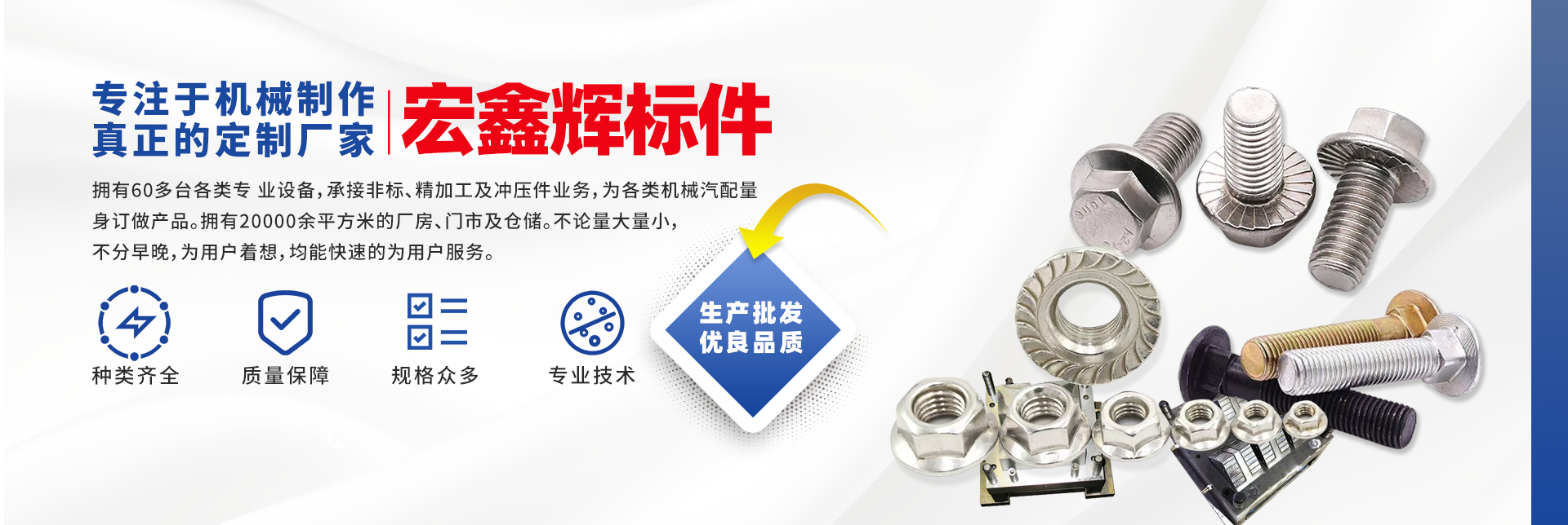 四川宏鑫輝標(biāo)準(zhǔn)件制造有限公司下設(shè):南充市宏輝機(jī)械制造有限公司,南充市聚宏機(jī)電設(shè)備有限公司,公司始建于1994年。為了拓展市場,降低成本,本公司于2007年、2020年分別在南充、 成都、重慶創(chuàng)建了生產(chǎn)基地。擁有60多臺各類專 業(yè)設(shè)備,承接非標(biāo)、精加工及沖壓件業(yè)務(wù),為各 類機(jī)械汽配量身訂做產(chǎn)品。擁有20000余平方米的廠房、門市及倉儲。公司以誠信為本,竭誠為廣大客戶提供服務(wù)。不論量大量小,不分早晚,為用戶著想,均能快速的為用戶服務(wù)。 公司所生產(chǎn)及代理的產(chǎn)品為業(yè)界人士公認(rèn)的國內(nèi)、國際優(yōu)等品牌。在產(chǎn)品性能與質(zhì)量
